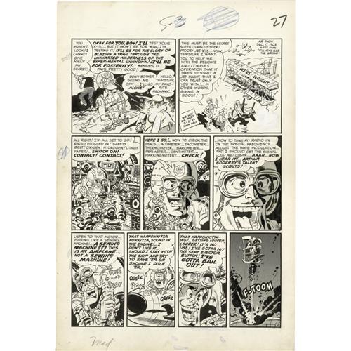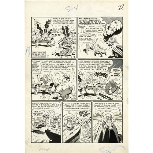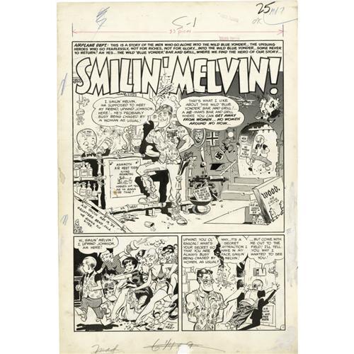<B>Wally Wood - Mad #7 Complete 7-page Story "Smilin' Melvin" Original Art (EC, 1953).</B></I> Zack Mosely's popular <I>Smilin' Jack</B></I> strip takes a blast of prop-wash from this "Smilin' Melvin" lampoon, piloted by the original <B>Mad</B></I>-men, Harvey Kurtzman and Wally Wood. Wood packs in the side-jokes and background business, drawing what he dubbed "clutter," and what Kurtzman termed "chicken fat," and things go from <I>Smilin' Jack</B></I>'s CAVU to "Smilin' Melvin's" SNAFU. The image size of each page measures approximately 13" x 18". As an added art bonus, there are several great Wally Wood sketches on the backs of two of the pages. There is a piece out of the bottom border of page one; otherwise, the art is in Very Good condition. Don't miss this chance to win a classic of high-flying <B>Mad</B></I> humor, created by two of the greatest talents ever in the history of comics.