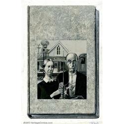 Wally Wood - Original Art for Mad #59, page 39 (EC Comics, 1960). From the twisted mind of Wally Wood comes this incisive parody of Grant Wood's American Gothic, illustrating the feature "The Parent from the Ages of 21 to 60." Fully rendered in acrylic greytones on heavy illustration board, this piece measures approximately 11.5" x 20", with an approximate image area of 9.75" x 15". Some of Wood's best work was done during his time at Mad, with his painted material considered by many to be the cream of the crop. Rarely offered for sale, this is a unique piece of Americana. Important notice: We expect to be auctioning lots at the rate of 200-250 per hour. Sometimes eBay Premier live bid software cannot keep up with that pace, so we strongly recommend that you place a realistic proxy bid now as insurance to avoid disappointment. Also please note that all Heritage/CAA lots purchased through eBay Premier carry a 20% Buyer's Premium. Please make sure you read the Terms and Conditions.