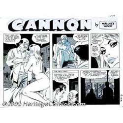 Wally Wood - Original Comic Strip Art for Cannon (Wood and Richter, 1973). Created in the early 1970s for The Overseas Weekly, Cannon gave Wally Wood a chance to do a rugged adventure strip, with plenty of beautiful naked women thrown in for good measure. Recognized as some of the best work of Wood's career, this strip is offered in two pieces, as is typical for these comics. The top panel measures approximately 17.75" x 13.75", with an image area of approximately 16.75" x 12.25", while the bottom panel measures approximately 17.75" x 11.25", with an approximate image area of 16.75" x 10.25". Both pieces are in excellent condition, with moderate use of blue pencil and white-out. This is a great example of a master at his finest, and deserves an honored place in a fine collection. Important notice: We expect to be auctioning lots at the rate of 200-250 per hour. Sometimes eBay Premier live bid software cannot keep up with that pace, so we strongly recommend that you place a realistic proxy bid now as insurance to avoid disappointment. Also please note that all Heritage/CAA lots purchased through eBay Premier carry a 20% Buyer's Premium. Please make sure you read the Terms and Conditions.