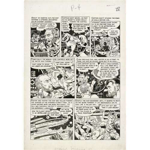 <B>Wally Wood - Weird Science #8, page 4 Original Art (EC, 1951).</B></I> Wally Wood's wondrous work for <B>Weird Science</B></I> established his legacy as a science fiction master. Spotlighting a desperate struggle to survive in the harsh environment of outer space, this detailed page superbly showcases Wally Wood's science fiction art at its best. These starkly lit and dramatic scenes demonstrate Wood's uncanny mastery at drawing light and shadow effects. This page from "The Probers" has an image area of 13" x 18", and the art is in Excellent condition
