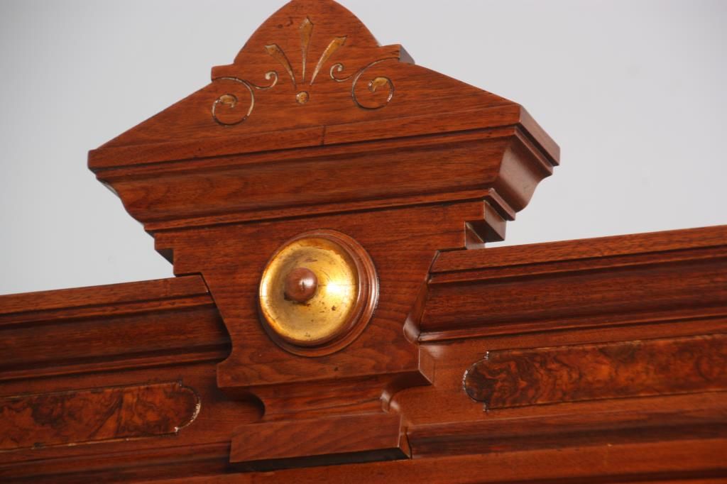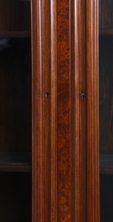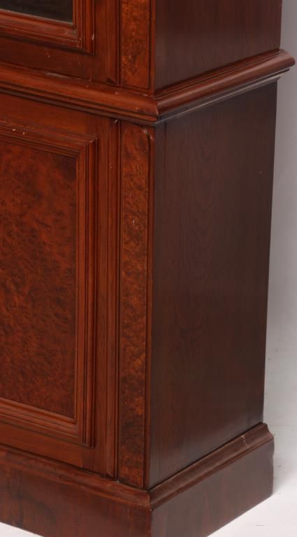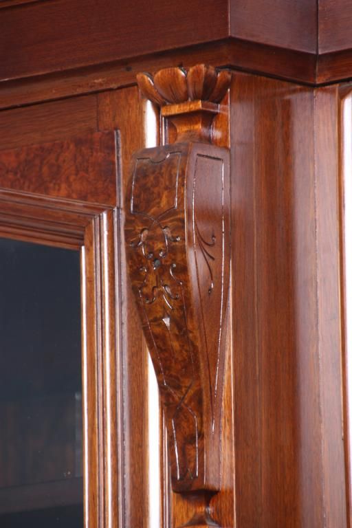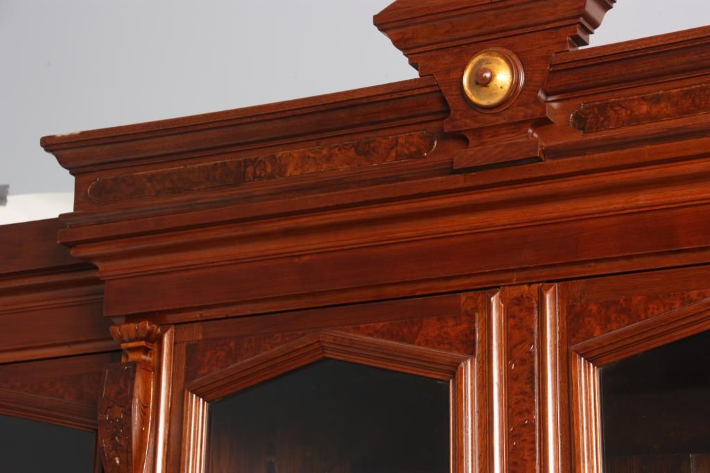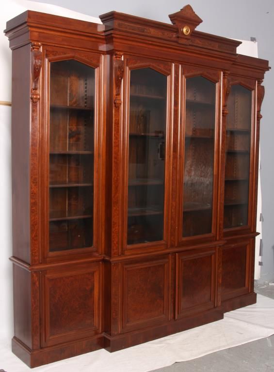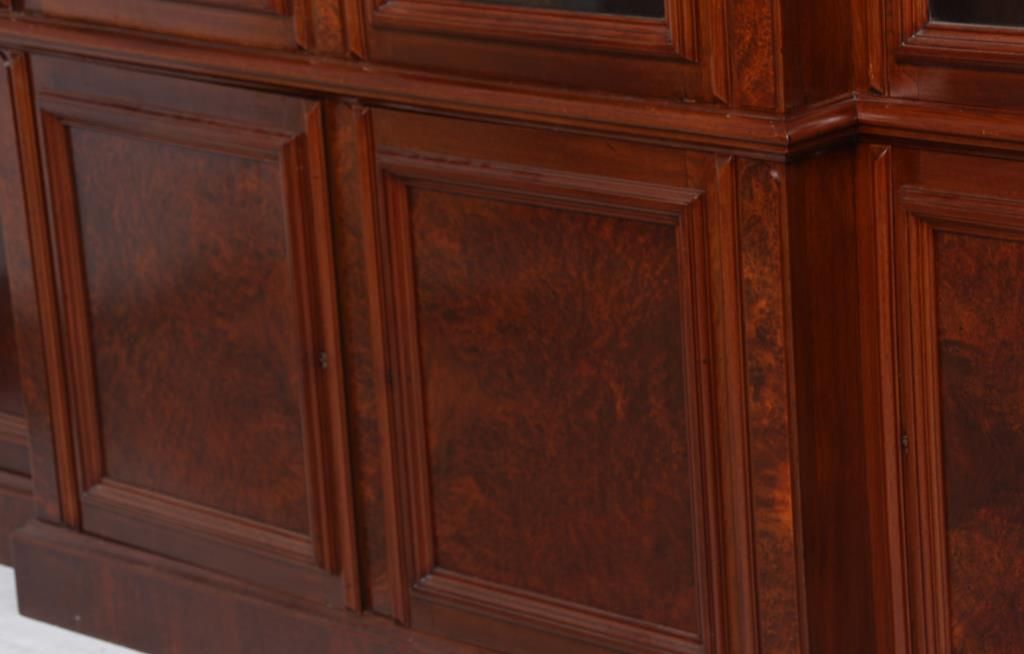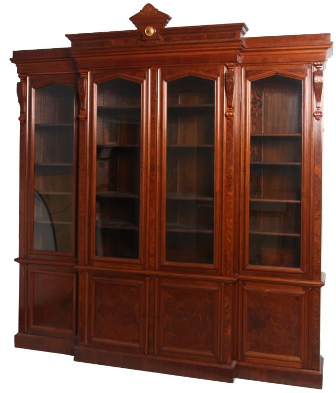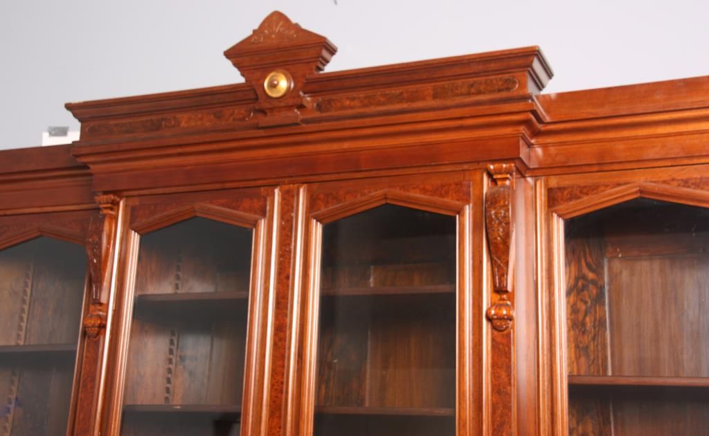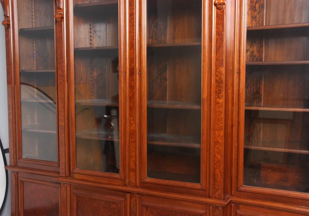 Walnut 4 Dr. Breakfront Bookcase. Block-front form with high pediment carved crest, burled walnut panels and trim work, carved pendant pilasters with pineapple carvings on the sides of the doors; has 4 glass front doors with 2 doors in the center section and single doors outside, matching base with inset burled walnut panels in the doors. In good condition with a clean French polished finish. 107 in high x 98 in. wide x 18.5 in. deep.