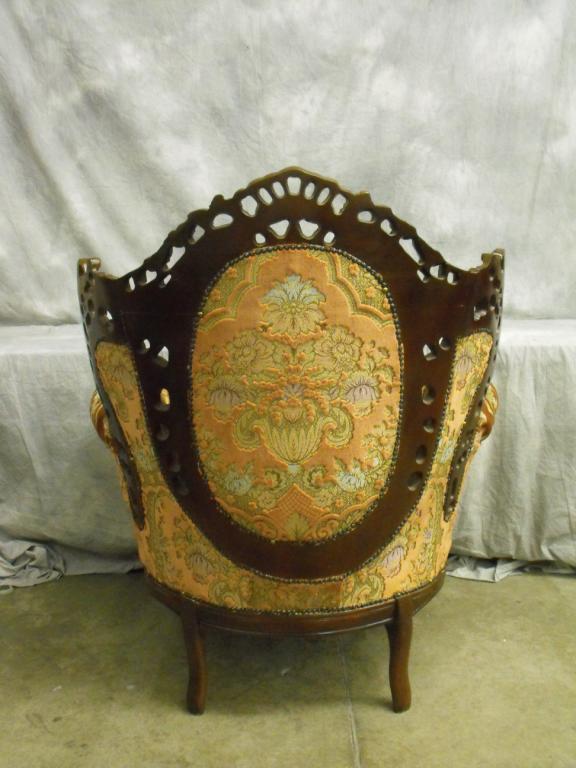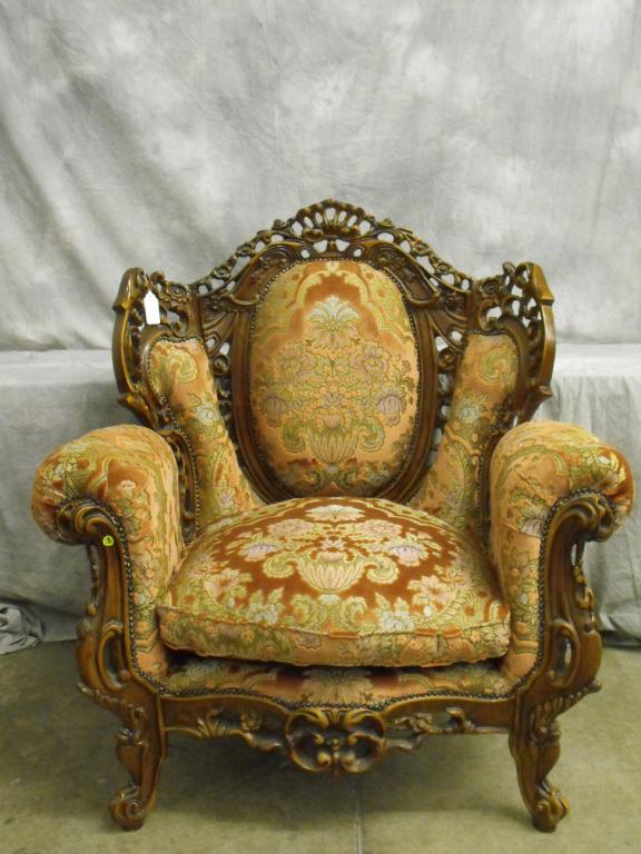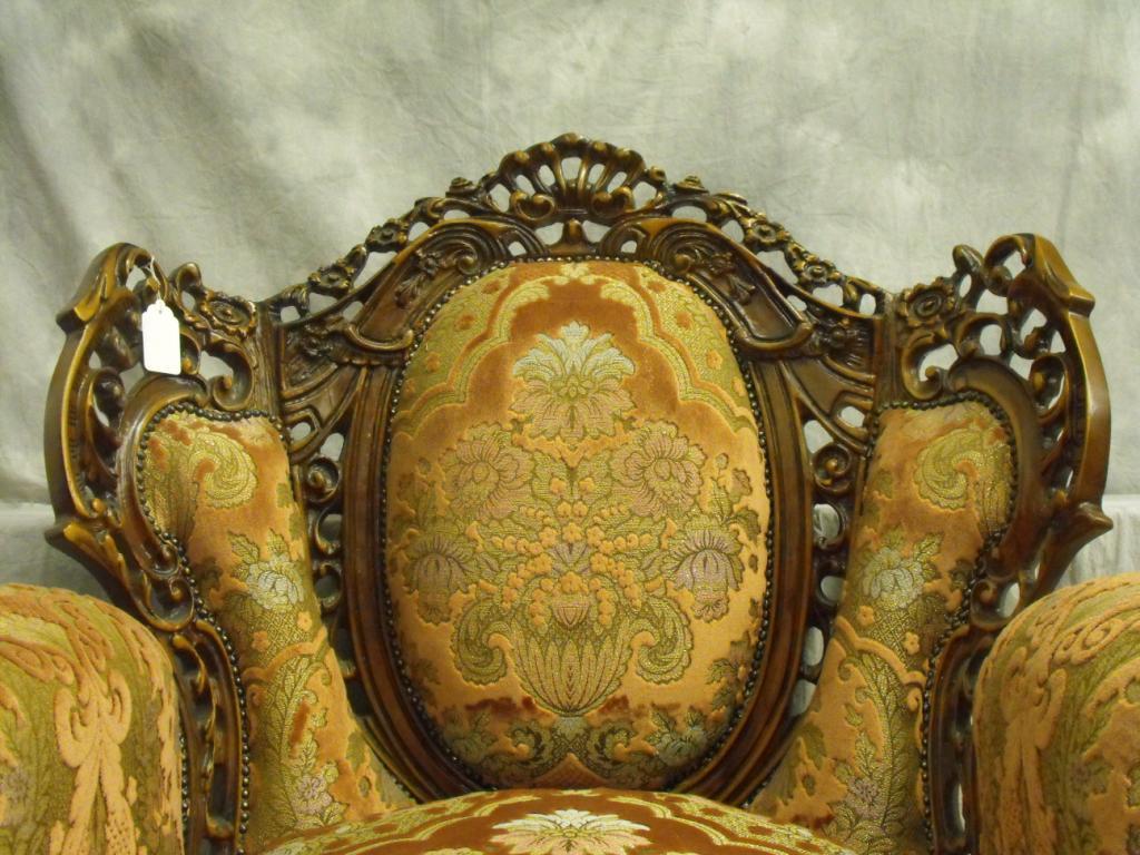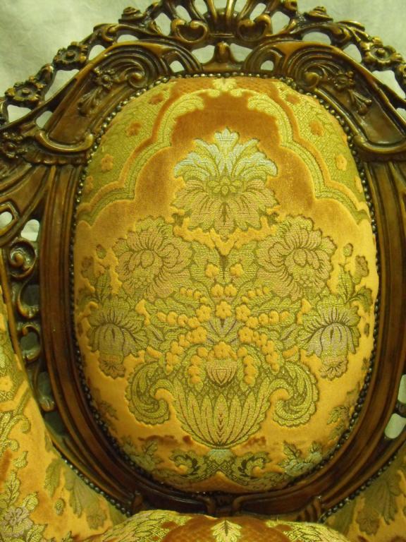 Louis XV Style Carved Walnut Bergeres with Serpentine Crestrail with Large Pierced Shell Crown Flanked by Scroll Work and Foliations with Roses and High Winged Ends, Regal Rose Cut Velved Brocade with Foliose Configurations of Roses in