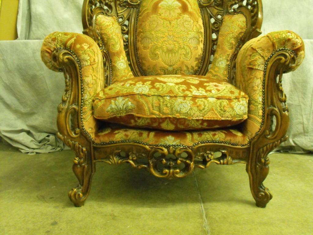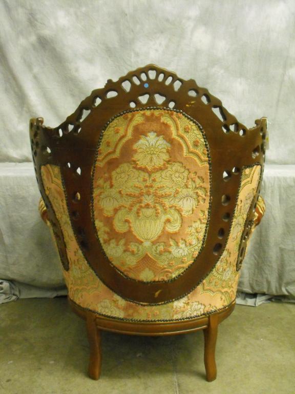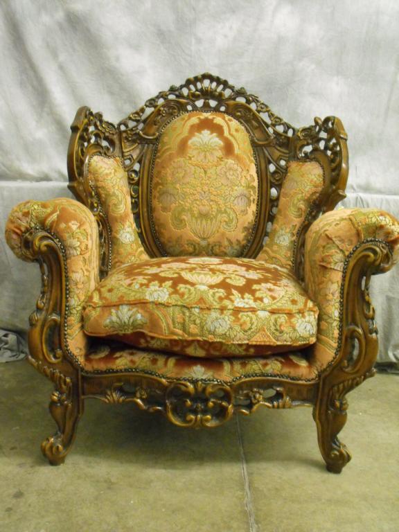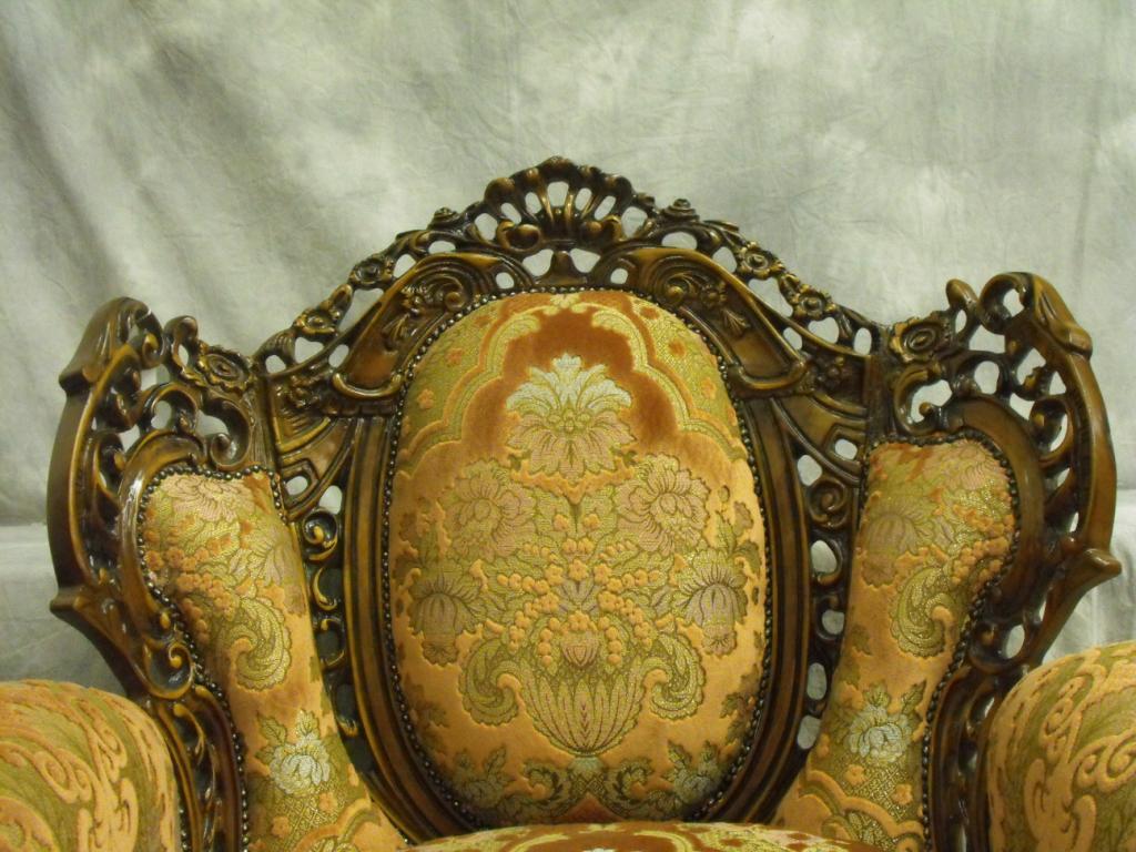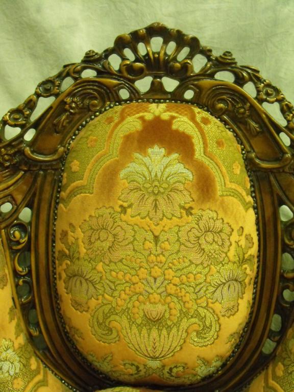 Louis XV Style Carved Walnut Bergeres with Serpentine Crestrail with Large Pierced Shell Crown Flanked by Scroll Work and Foliations with Roses and High Winged Ends, Regal Rose Cut Velved Brocade with Foliose Configurations of Roses in