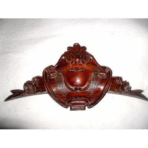 </font></strong>Handsome hand carved walnut ornament or wall hanging is from England C.1850-60. The thick wood expertly carved in the form of a shield with another shield atop. Wonderful plume header and rosebud sides. Fine tooling along sides of the top shield. Most likely from a magnificent piece of hand made furniture,the plaque offers two holes in back for wall hanging,above a door or the center facade of a fireplace. Exellent condiiton which measures 15L X 7.5H X 2D.</font>