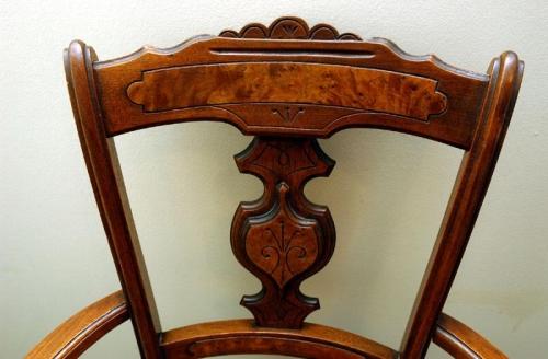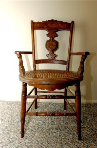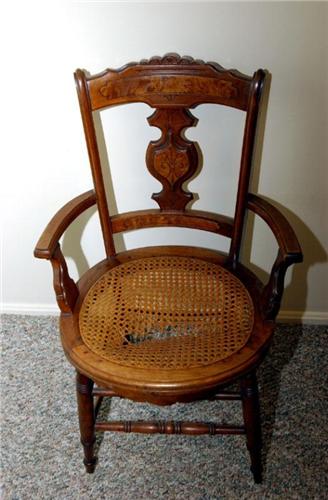 Walnut open arm chair with broken cane seat and side arms, 33 1/2" by 20" by 18".