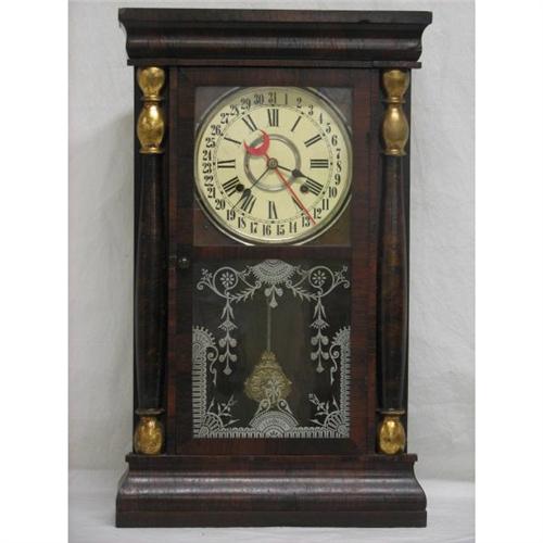 Walnut Clock with Steeples 25 H, 15 1/4 W, 4 1/2 D. Condition: wear commiserate with age.