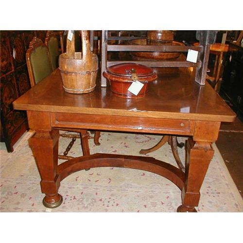 Wonderful walnut table suited for grand dining or a stunning conference area.Modified for lamp or computer equipment. Simple lines,beautiful wood grain, and brass feet make this special piece a great find! One peice top.