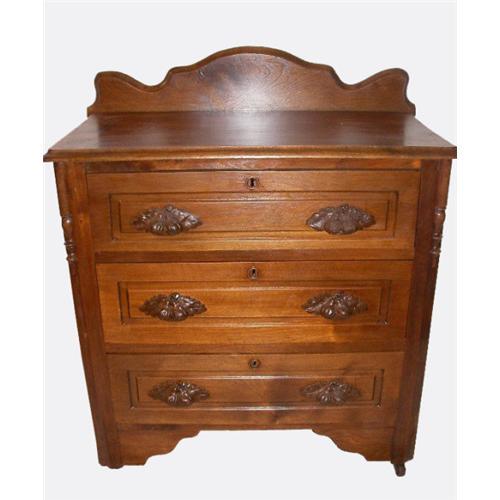 This is a beautiful walnut dresser with three large drawers and a scalloped top detail. All of the drawers have dovetail joints on the front. The drawer pulls are carved wood in the shape of pears and leaves. There is also a raised keyhole on the front of each drawer.
