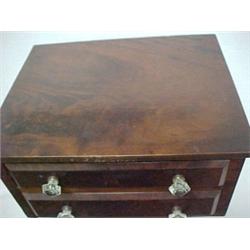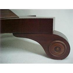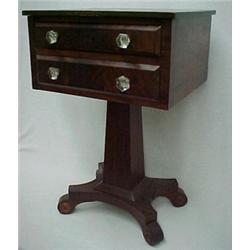 Walnut Empire sewing stand, rectangular top over two drawers, glass knobs, on square tapered standard, four sided base on stylized scroll feet, C. 1840, top drawer with divided interior Estimate 300/500
