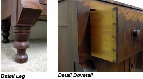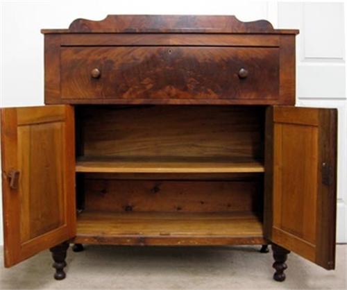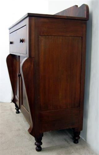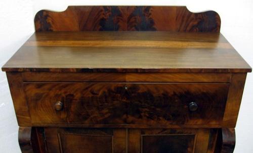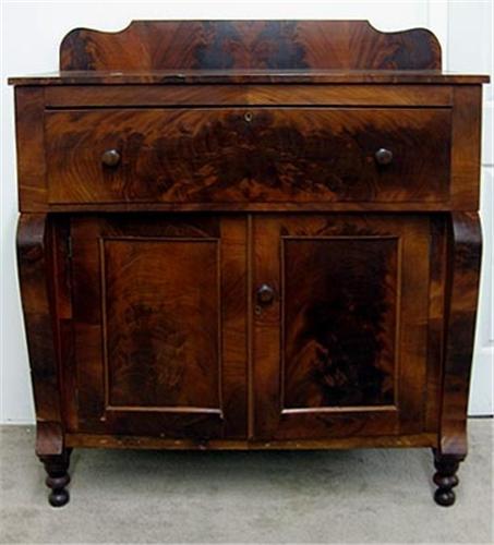 Walnut Empire sideboard; scalloped splashback over rectangular top; one long drawer over two doors with recessed panels; bun feet; C. 1850; measures 51" high x 42" across x 20" deep (slight veneer loss near bottom)