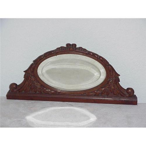 A carved walnut frame holds this 9 1/2" X 5 3/4" oval and beveled mirror. The overall length is 18 1/8" and the height is 8 3/4". The mirror was originally on a piece of furniture and lovely on its own or added to your piece of furniture or even made into a wall shelf. The wood has a beautiful patina and the silver on the mirror has some spotting form age. (3)