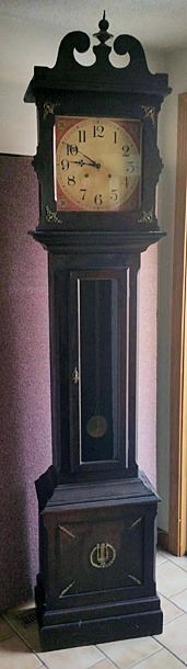 Walnut Grandfather Clock, Ithaca, NY maker, all original with pendulum and brass finial, brass lyre and accents on base and face, brass door handle.