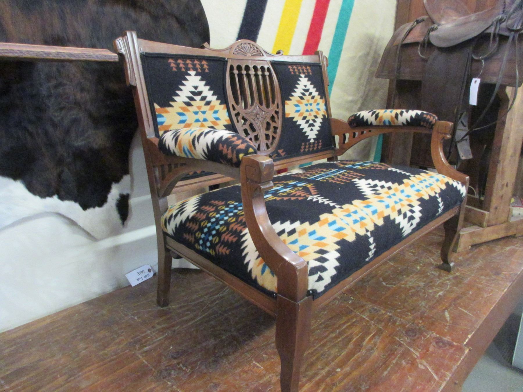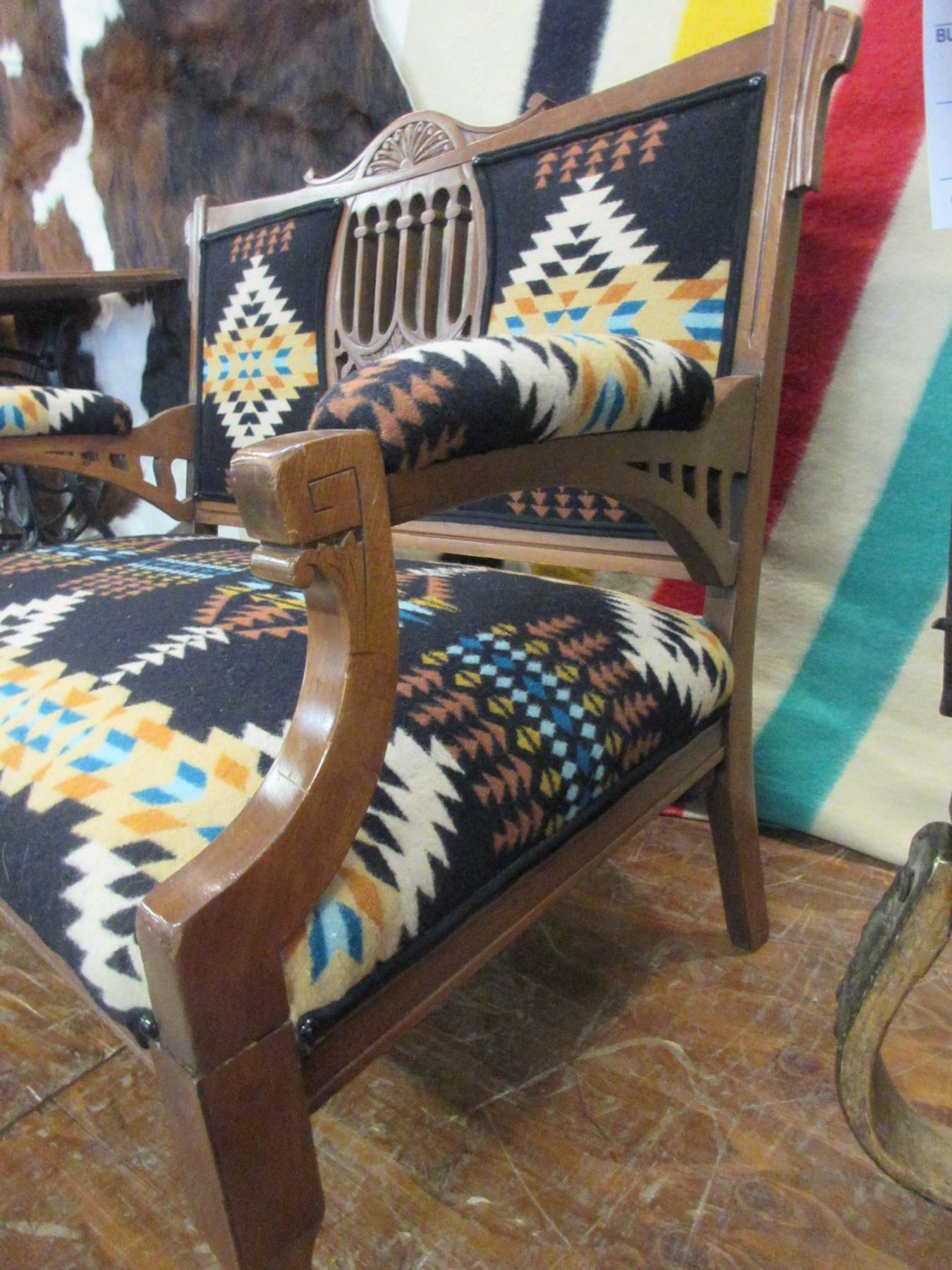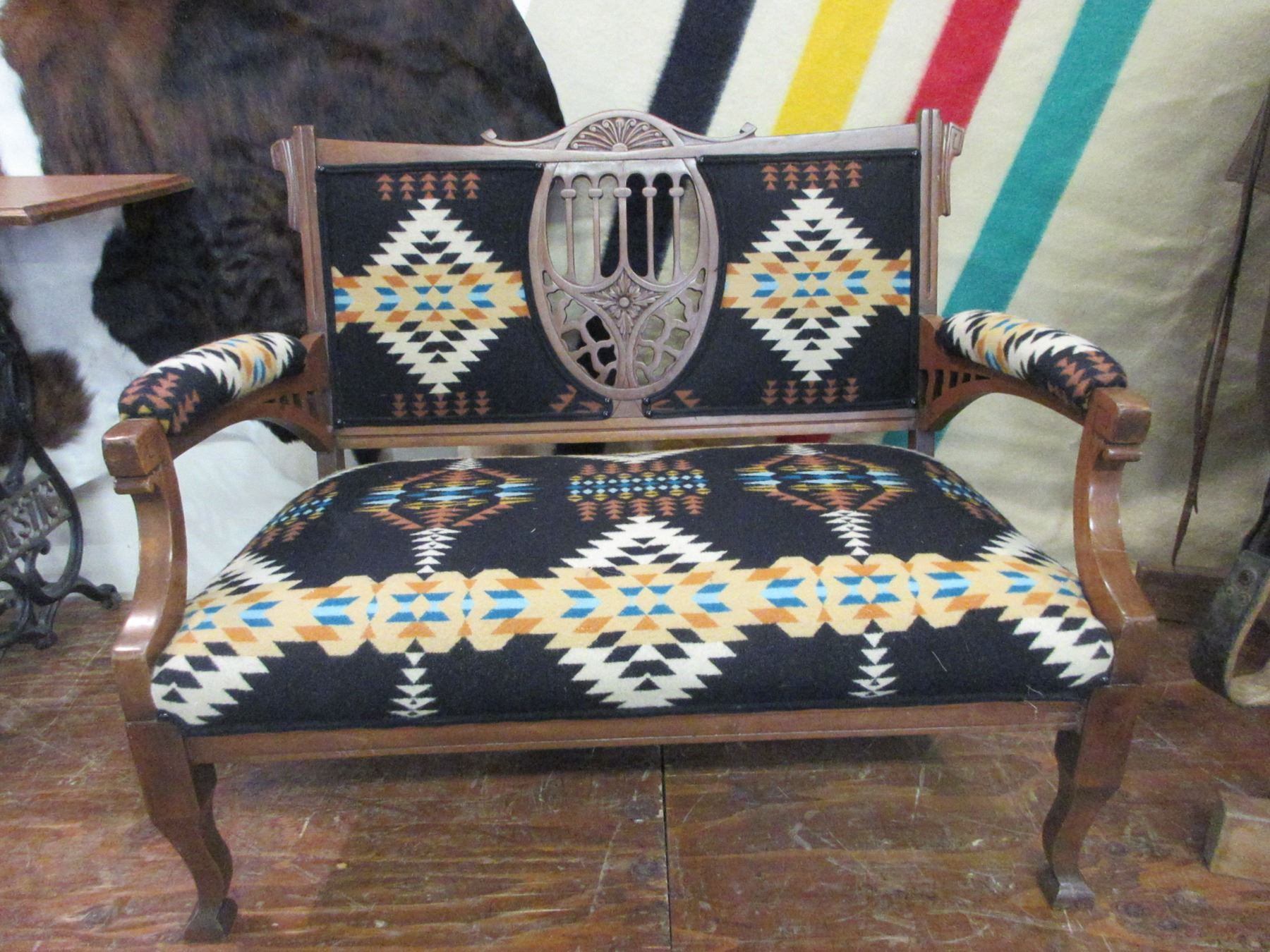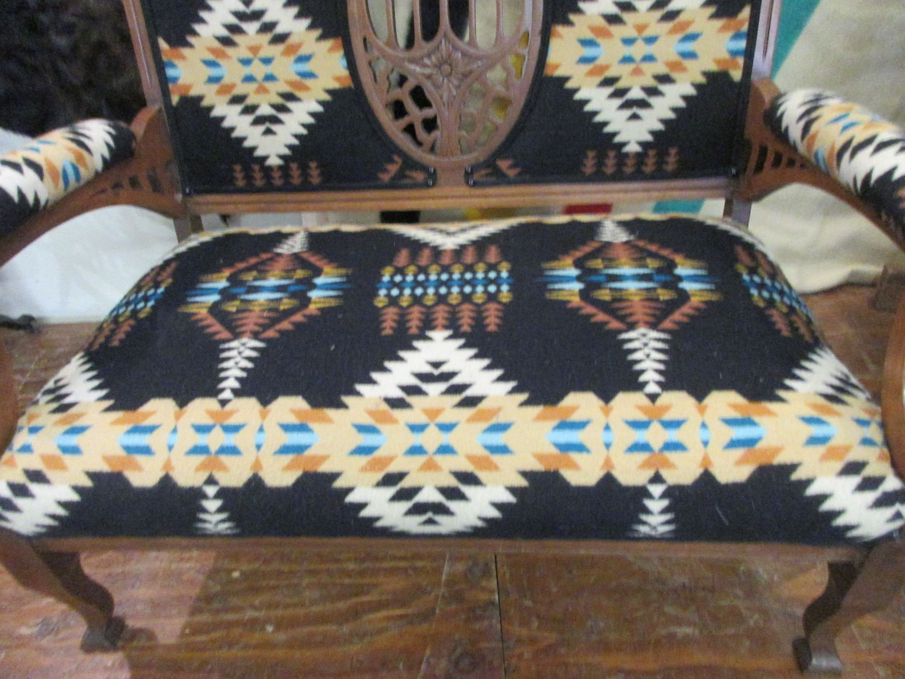 Walnut Harp Style Eastlake Love Seat- Covered With Pendleton Blanket- C 1900's- 32"H X 38"W X 22"D- Good Condition