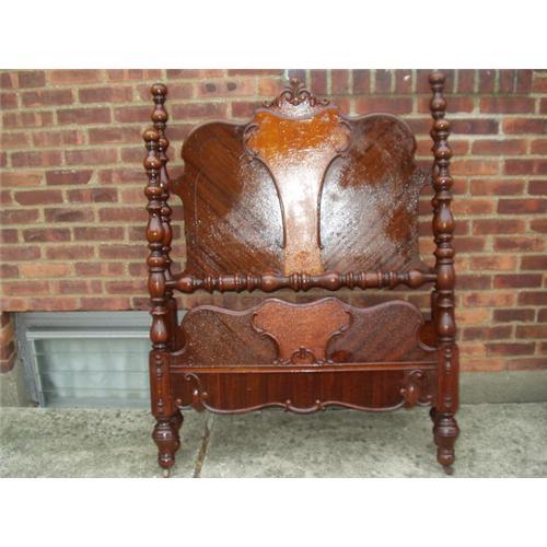 Offered is a very beautiful and exquisitely carved walnut veneer high post single bed whose headboard measures 54 inches high by 40 inches wide, and its footboard is 48 inches high by 40 inches wide. This piece has a lovely carved crest on its headboard and nice carvings on its footboard. This single bed is in very good condition save a few light surface scratches and a few nicks, which do not detract at all from its overall appearance. Also, this piece includes sideboards and wooden slats. Please zoom the photos and you will see the elaborate detail and lovely carvings and veneer work on this piece. Consider adding this beautiful piece to your bedoom set collection!