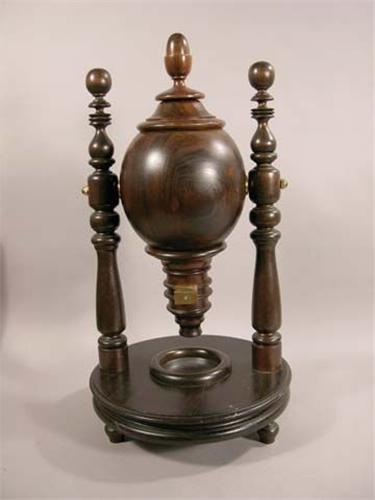 Walnut keno goose with acorn finial including wooden numbered balls & Louis T. Duckert & Son, Keno card #590.