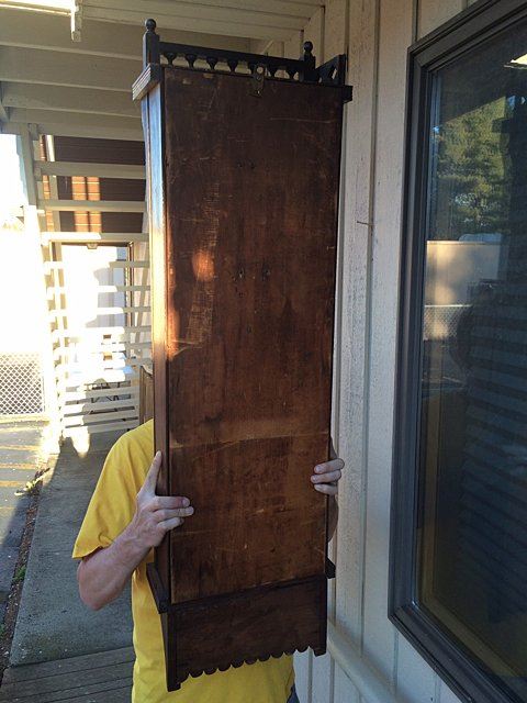 Carved Walnut Regulator Clock, Eastlake style carved case, beveled glass door, key wind with pendulum. Measures approx. 48" tall x 14" wide x 6" deep.