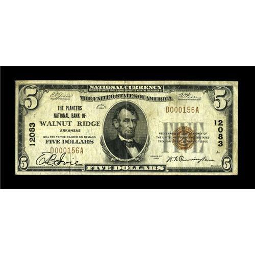 <B>Walnut Ridge, AR</B></I> - $5 1929 Ty. 1 <B>The Planters NB</B></I> Ch. # 12083<BR>This piece bears one of the great names in Arkansas Nationals, and is excessively rare to boot, as it is one of just two Series 1929 examples extant from this bank. The other example reported from here has been off the market since we last sold it in 1994, making this attractive specimen the sole small note available to collectors from this rare bank. Sharp <B>Fine-Very Fine,</B></I> a true Arkansas small size trophy item.<BR><BR><b>Shipping:</b> Coins & Currency (<a target="_blank" href="http://www.heritageauctions.com/common/shipping.php">view shipping information</a>)
