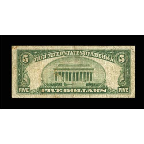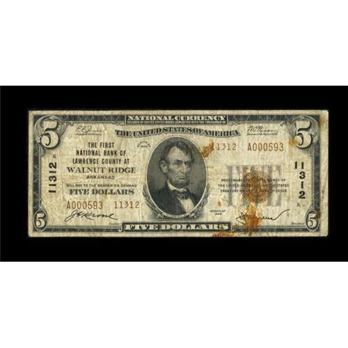 <B>Walnut Ridge, AR</B></I> - $5 1929 Ty. 2 <B>The First NB of Lawrence County</B></I> Ch. # 11312<BR> It is the rare sale indeed when we are able to offer notes from two of Walnut Ridge's issuing banks. This piece, from the Kansas City collection, is one of just four listed in the census. It's not a bad note, but some rust stains on the front do affect its value considerably. <B>Fine, </B></I>rust. <BR><I>From The Kansas City Collection.</B></I><BR><BR><b>Shipping:</b> Coins & Currency (<a target="_blank" href="http://www.heritageauctions.com/common/shipping.php">view shipping information</a>)