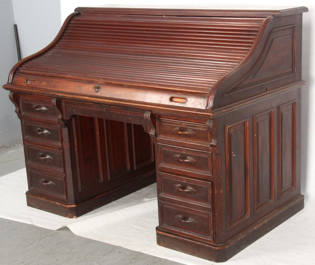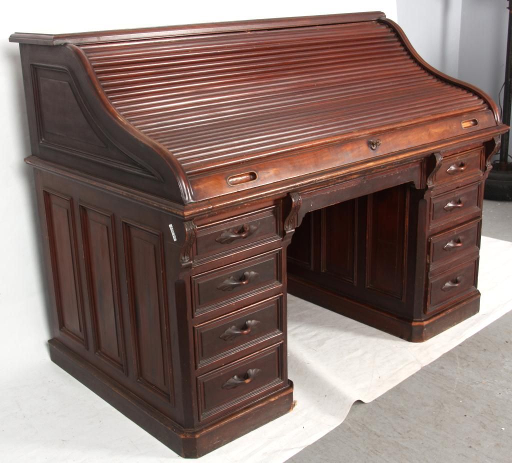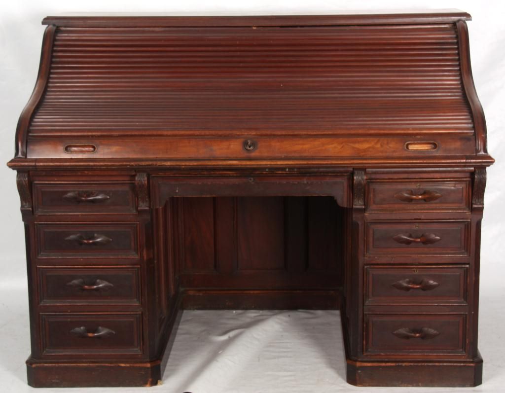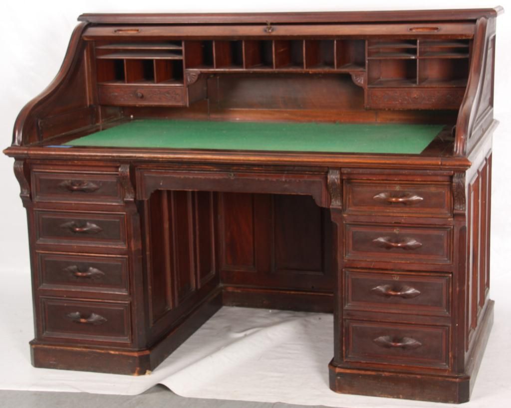 Walnut S-Roll Top Desk. Serpentine roll top desk, has 17 compartments and 3 drawers in the interior and a felt top, slide out writing surface; the base has 2 banks of drawers with carved pulls, leafy corbels under the top and long center drawer. Beveled & molded raised panels on all sides. In very good condition, original finish. 46.5 in. high x 59.5 in. wide x 36 in. deep.