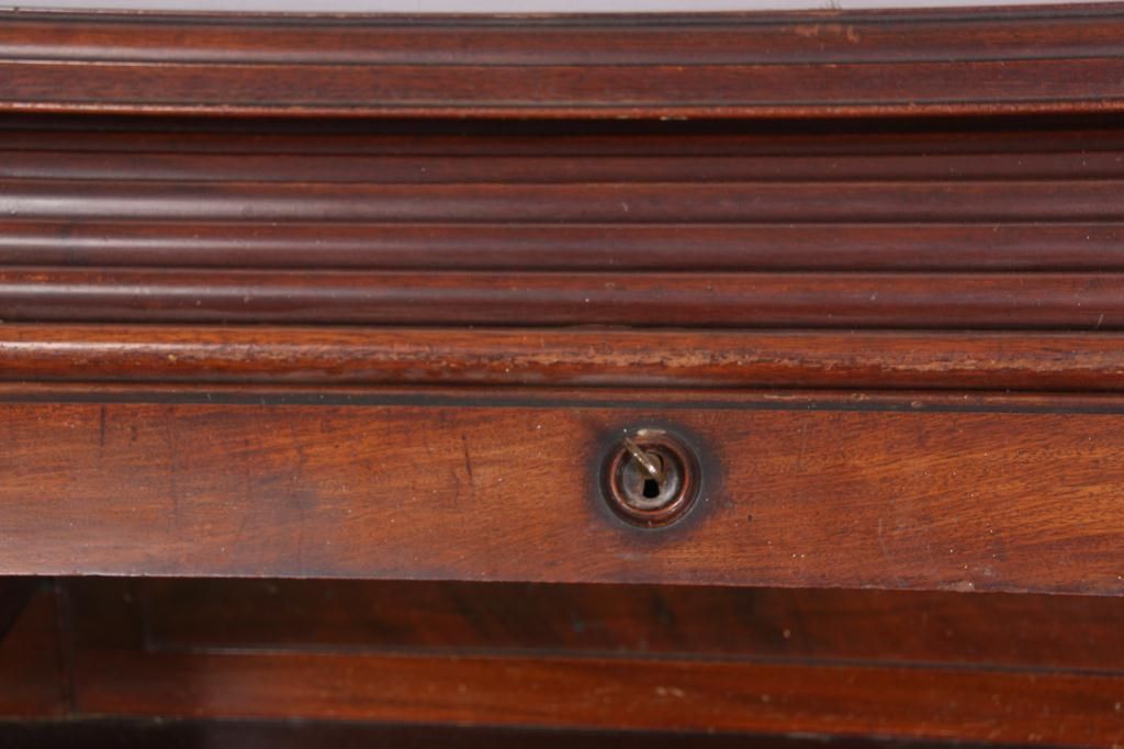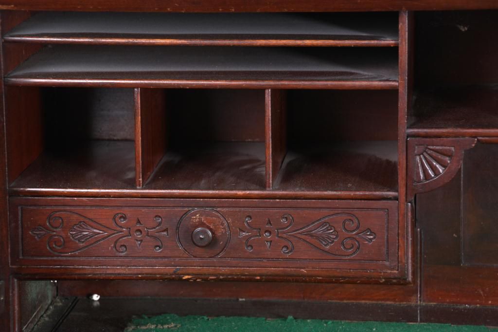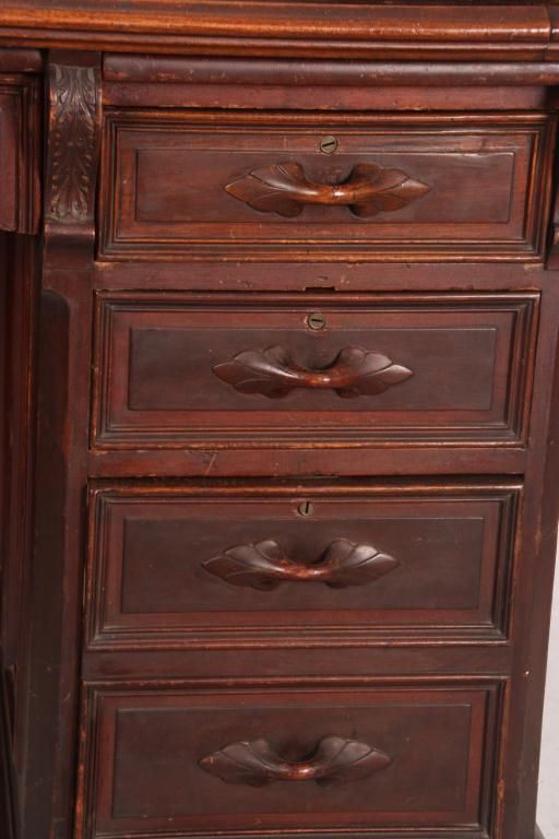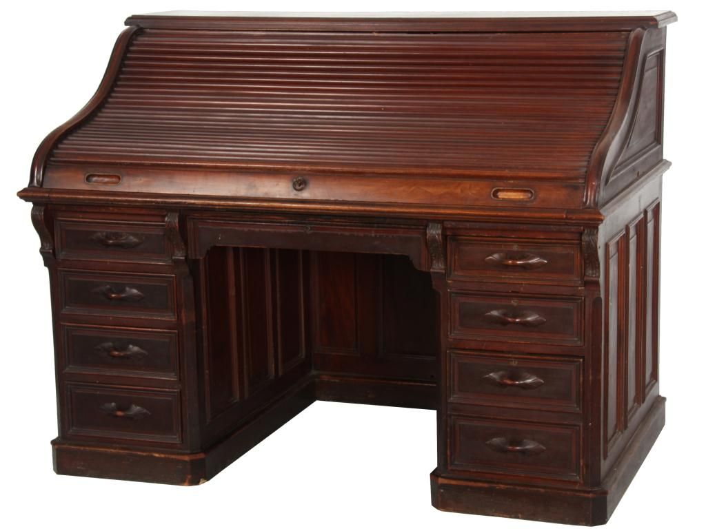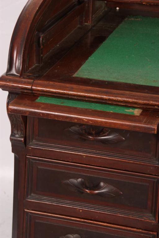 Walnut S-Roll Top Desk. Serpentine roll top desk, has 17 compartments and 3 drawers in the interior and a felt top, slide out writing surface; the base has 2 banks of drawers with carved pulls, leafy corbels under the top and long center drawer. Beveled & molded raised panels on all sides. In very good condition, original finish. 46.5 in. high x 59.5 in. wide x 36 in. deep.