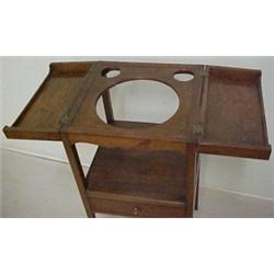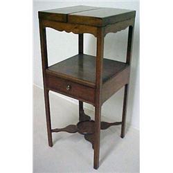 Walnut Sheraton washstand, fitted hinged top, opens to expose holes for wash basin and cups, over scalloped apron, undershelf with one drawer, on square legs, cross stretcher base with center fitting for pitcher, mid 19th C., measures 33 3/4" high (split on one side of interior top) Estimate 300/550