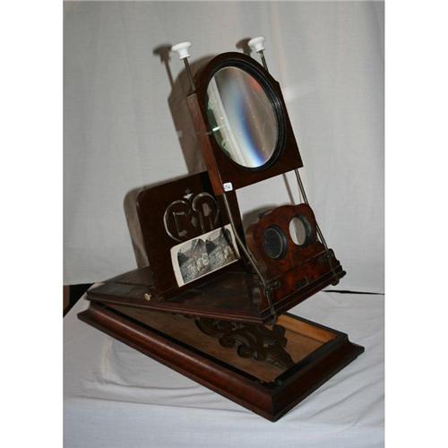 Walnut Stereoptical Viewer with Victorian styling. Very attractive table top viewer with large 7 ½” D light magnifier, adjustable height capabilities, decorative card holder. Measures approximately . 11" x 22" base.