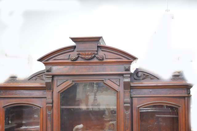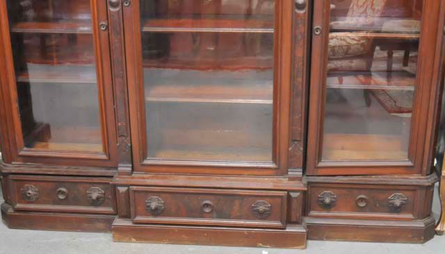 Burled walnut 3 drawer base, with interior shelves & arched carved bonnet. Approx. 77" H x 74" W x 15" D. Please read our terms of sale.