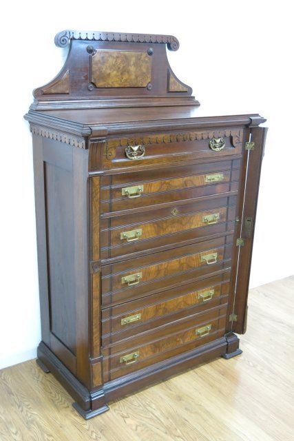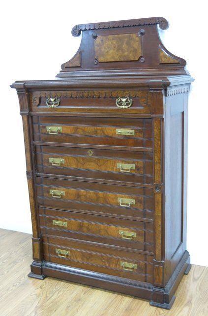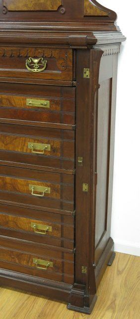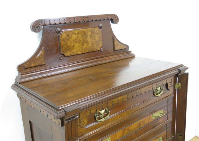 With burled walnut backsplash, 6 drawers. Approx. 53" high, (67" with backsplash), 21 1/4" deep, 39 1/2" wide