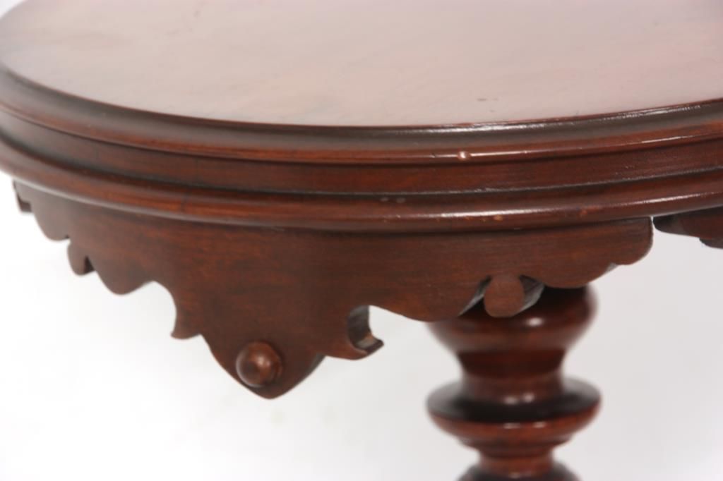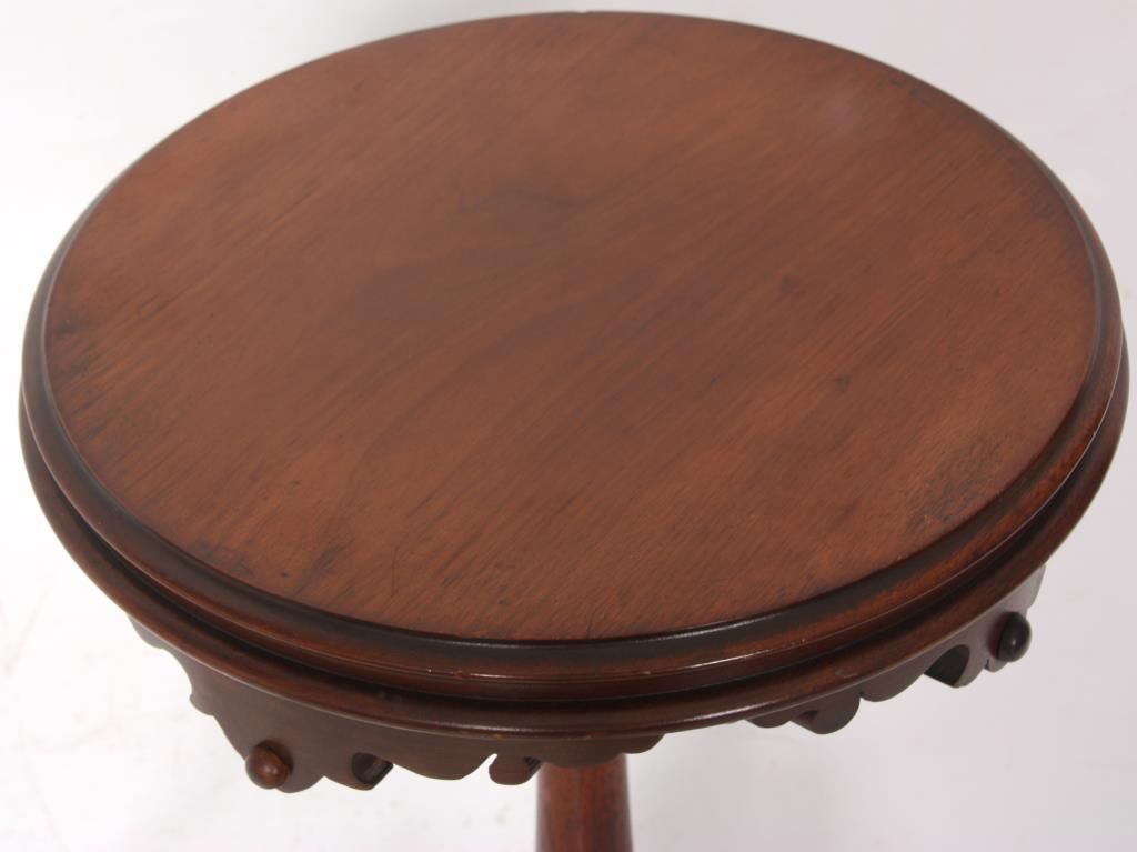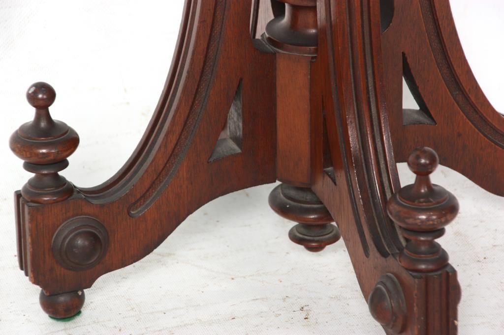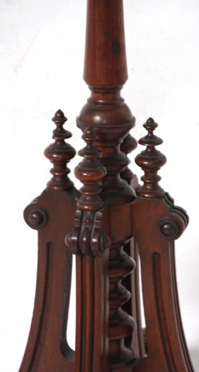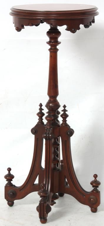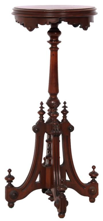 Carved Walnut Plant Stand. 13 in. dia. top with carving under the apron, reverse tapered turned center post with corbelled legs topped with turned finals and rosettes on the sides. In good condition, original finish with overcoat. 31 in. high.