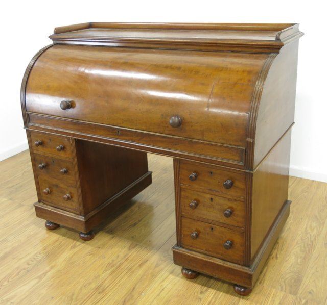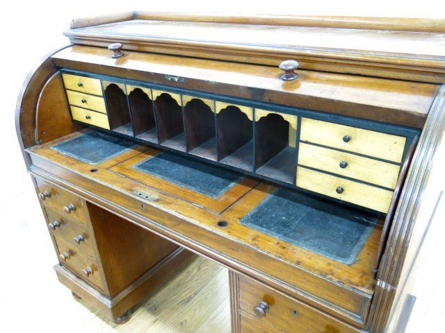 Full interior. Writing surface slides out. Lift top for manuscript writing or easel stand. 3 sections of gold tooled leather. Approx. 47" H x 54" W x 26 1/4" D.