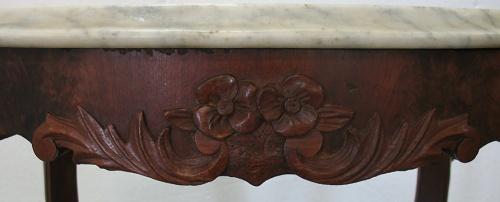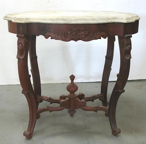 Walnut Victorian center table; beveled white marble top; on conforming base; applied decoration on apron and on cabriole legs; cross stretcher with center finial; scroll feet; C.1860-80; 28" high x 30" x 20" (some yellowing on marble top)