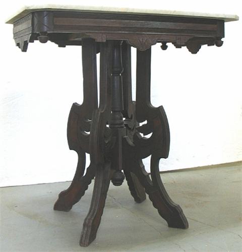 Walnut Victorian center table; rectangular white beveled marble top with chamfered corners and drop finials; ring turned standard with drop finials; carved stylized legs; C. 1870; measures 28 1/4" high x 28" across x 19 3/4" deep (surface scratches and slight discoloration on marble top)