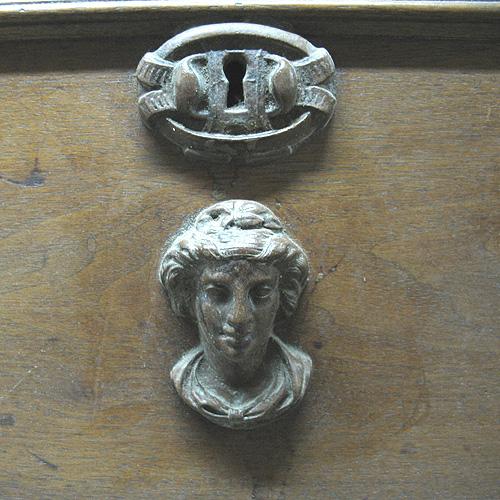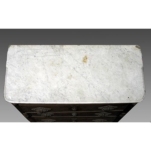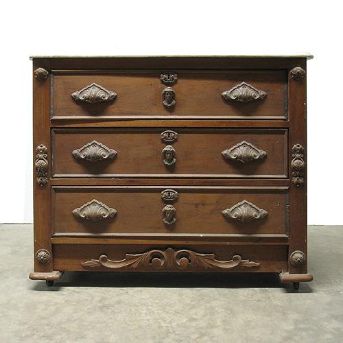 Walnut Victorian chest of drawers with beveled white marble top over three long drawers; each with applied mask decoration under carved escutcheons; carved drawer pulls; applied medallion decoration on stiles; and applied swag decoration on hidden drawer; on casters; C.1860; 32" high x 40 1/2" across x 19" deep (missing trim pieces on top and bottom drawer)