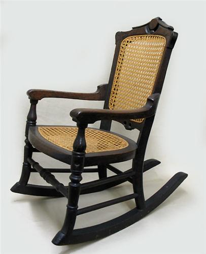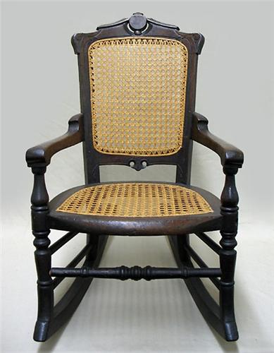 Walnut Victorian child's rocker; carved crest rail over cane back; open arms flank cane seat; C. 1870; measures 25" high x 14" across x 23" deep (no visible defects)