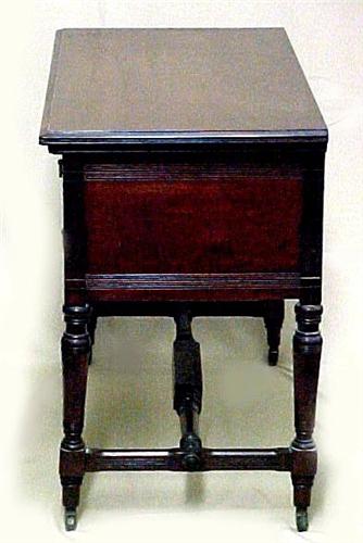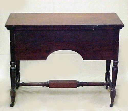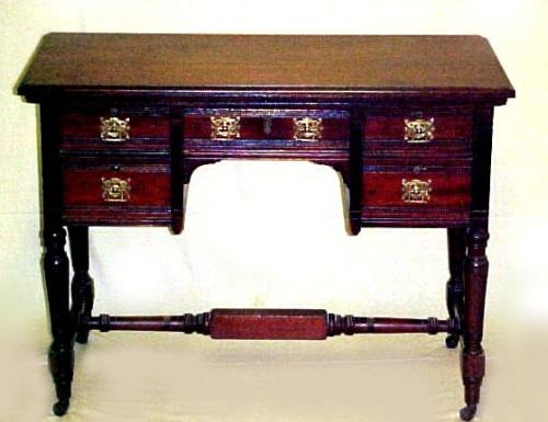 Walnut Victorian desk; rectangular top with chamfered edge; two short drawers on each side flanking center drawer; block and turned legs (on casters) and H stretcher; original hardware; measures 29 1/2" high x 40" across x 19" deep (no visible defects)WILL NOT SHIP.