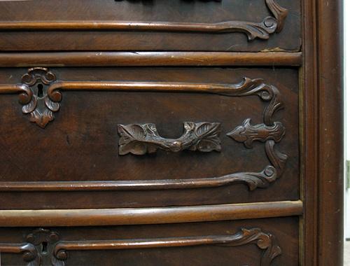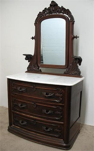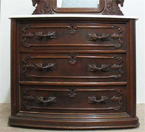 Walnut Victorian dresser; carved crest over swivel mirror with candlestands; beveled white marble top; over three drawers; each drawer front with applied decoration and leaf and twig carved handles; on base with casters; C.1870; 70" high x 36" across x 22" deep (no visible defects)