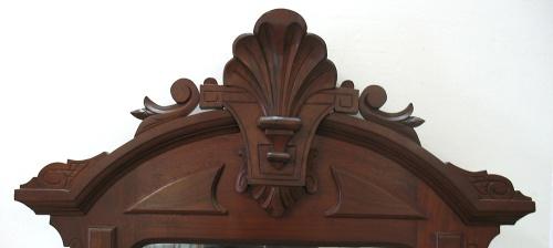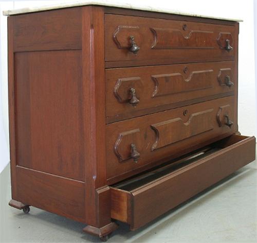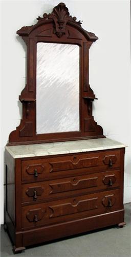 Walnut Victorian dresser with mirror; applied crest over mirror; candlestands flank mirror; beveled white marble top; applied burled panels on drawer fronts; three drawers with teardrop pulls; hidden drawer in bottom; on casters; C.1860-80; 87" high x 43 1/2" x 18 1/4" (no visible defects)