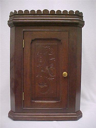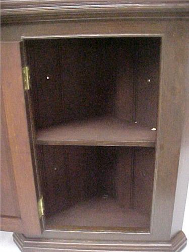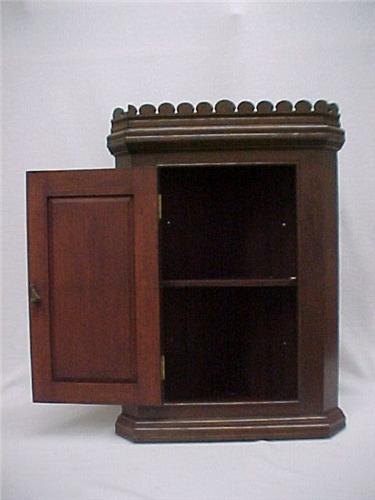 Walnut Victorian hanging corner cabinet; scalloped trim over molded cornice; single door with raised panel; decorative carving on panel; molded base; one interior shelf; measures 27 1/2" high x 19" across; late 19th C. (no visible defects) Estimate 120/25