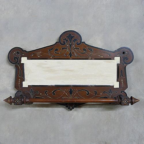 Walnut Victorian hanging mirror with towel bar; incised and painted stylized decoration; inscribed "Mr. B. and Mrs. BPB. 1874 on back"; 14 1/2" high x 24" across x 5" deep (no visible defects)