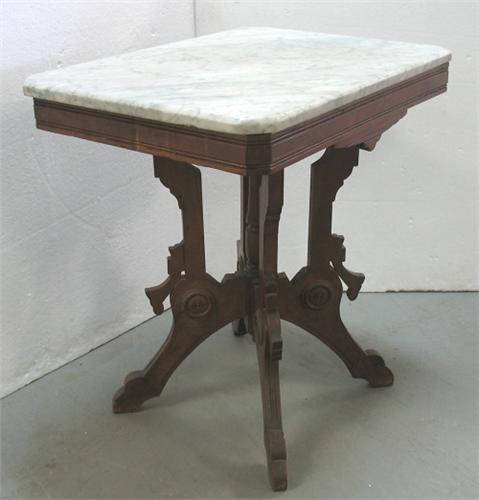Walnut Victorian marble top table; beveled white rectangular marble top on table with chamfered corners; ring turned center standard with drop finial; four stylized legs with medallions at knees; C.1860; 29" high x 28" x 20" (no visible defects)