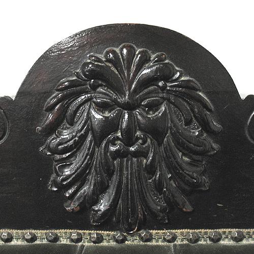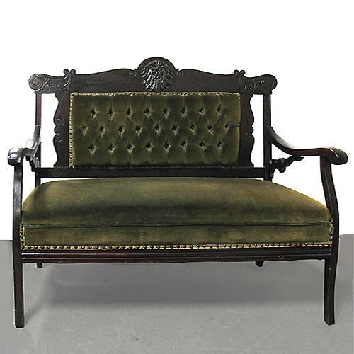Walnut Victorian settee; mask carving on crest rail; over velvet upholstered button back and upholstered seat; C.1890; 39" high x 46 1/2" across x 21" deep (no visible defects)