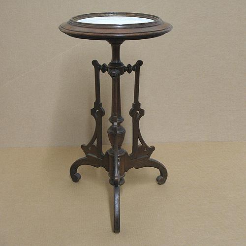 Walnut Victorian stand with white marble top; vase turned standards; three stylized supports; on scroll tripod feet; mid to late 19th C.; approximately 30" high