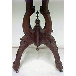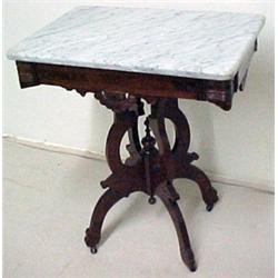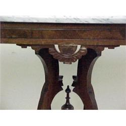 Walnut Victorian table, white rectangular beveled marble top, carved apron on four stylized legs with center drop finial, on casters, 30" high x 26" across x 17 1/2" diameter, C.1880 Estimate 300/450