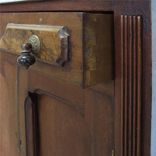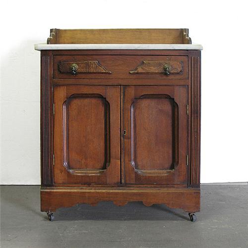 Walnut Victorian washstand; walnut backsplash over white beveled marble top; one long drawer with raised panel decoration on drawer front; over two recessed panel doors; scalloped molded base on casters; late 19th C.; 32" high x 26" across x 14" deep; replaced backsplash