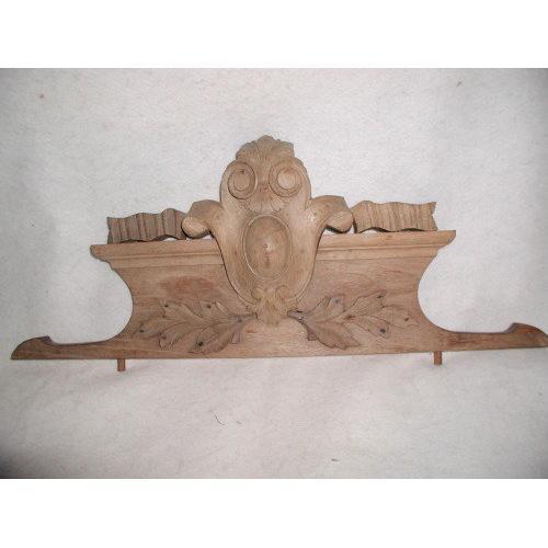 Natural walnut without stain ornate hand carved wall hanging from England 19th century. Originally the header for some fabulous piece of furniture as has dowels on either end. The thick shield center is a work of art as well as the leafing design below and chiseled upper ribbon. Wonderful over a door,mirror or just a wall. Hanger can easily be added to back. Two very minor nicks either end of the longest bottom portion. Measures 27L X 9.5H X 1.75D.