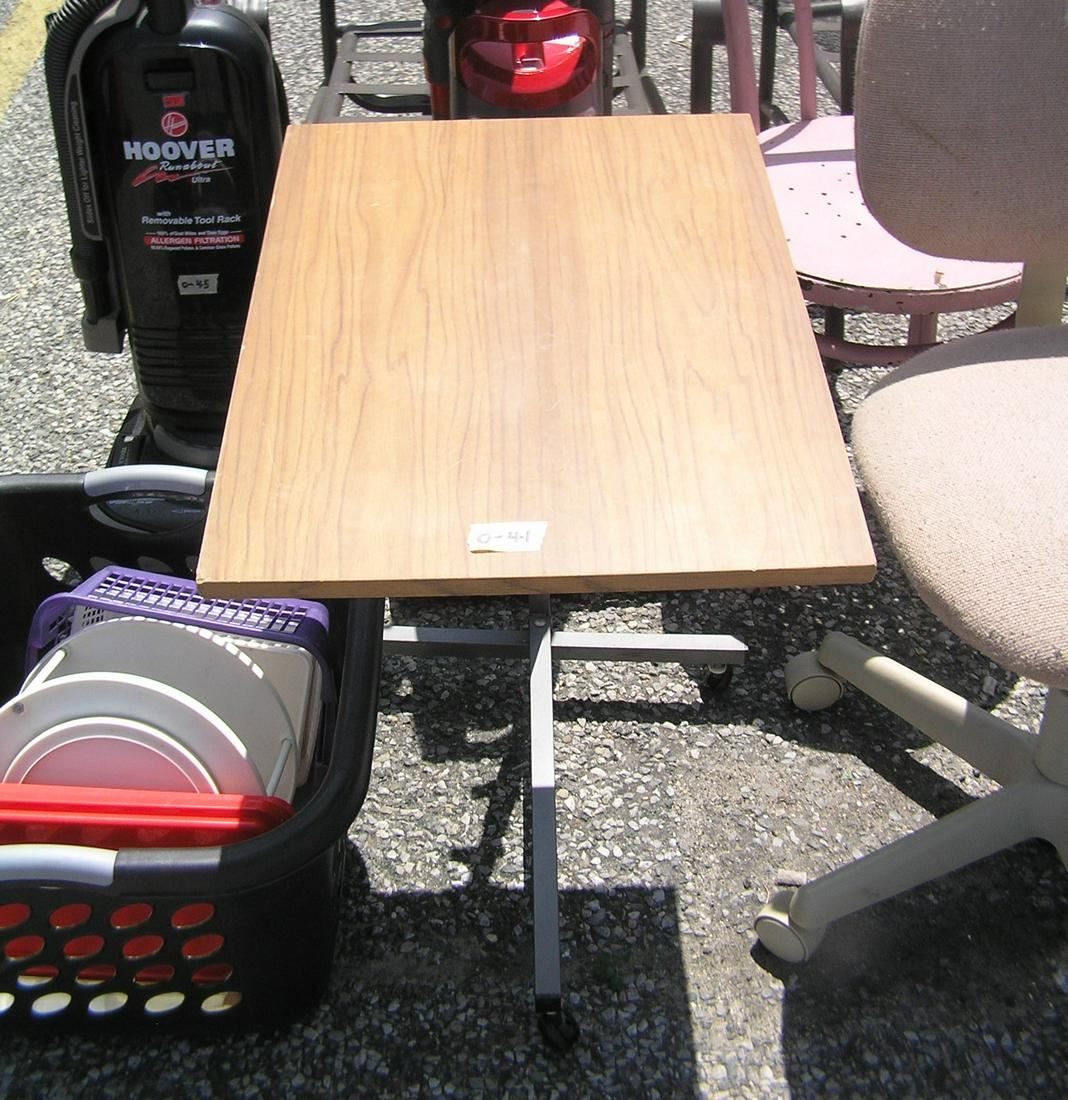 Walnut and metal snack or bedside table on castor wheels est. value $40.00-$50.00