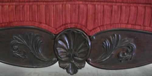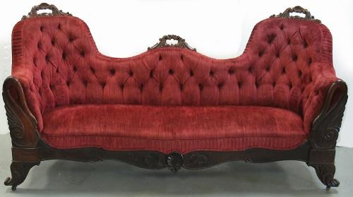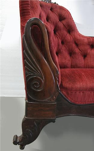 Walnut and velvet upholstered Victorian sofa; triple arch back with pierced walnut crests; button back; serpentine seat rail flanked by swan decoration on arm supports; scroll feet; C.1870; 50" high x 94" across x 36" deep (no visible defects)