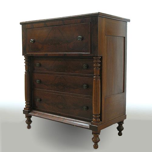 Walnut butler's desk; fall front top desk drawer with interior drawers and pigeonholes; over three long drawers flanked by turned side columns on ball feet