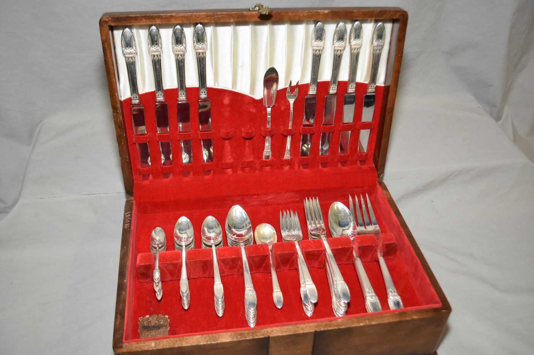 Walnut canteen containing a Rogers Bros. "First Love" silver-plate flatware including eight of dinner knives, fourteen dinner forks, six luncheon knives and twelve luncheon forks, eight tablespoons, eight each of two difference sizes of teaspoons, eight coffee spoons, four serving spoons, two serving forks, four small servers, sauce ladel and a pie slice