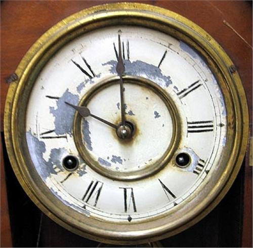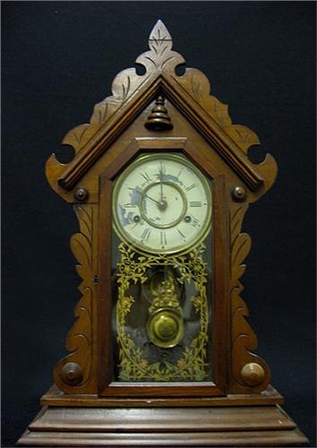 Walnut cased gingerbread shelf clock by Jerome & Co.; spring wind; with pendulum; gilt floral decoration on glass; partial paper label on back; late 19th C.; 26" high x 15 1/2" across x 4" deep (repair to top of case; some loss to dial)